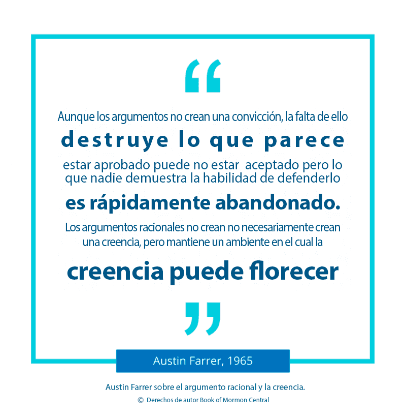 El élder Neal A. Maxwell en una ocasión citó al filósofo Austin Farrer, quien declaró que si bien un argumento racional—que es, razonar basados en un estudio cuidadoso de evidencia relevante—no necesariamente crea una creencia, fomenta una atmósfera que conduce a ello. La investigación en campos científicos, arqueológicos y lingüísticos a menudo esclarece los textos antiguos, incluyendo al Libro de Mormón. Los eruditos que argumentan a favor de los orígenes antiguos del Libro de Mormón ayudan a mantener un clima en donde las personas lo pueden tomar seriamente como una registro histórico, el cual, a su vez, puede ayudarles a aceptar y a adoptar completamente su mensaje espiritual.