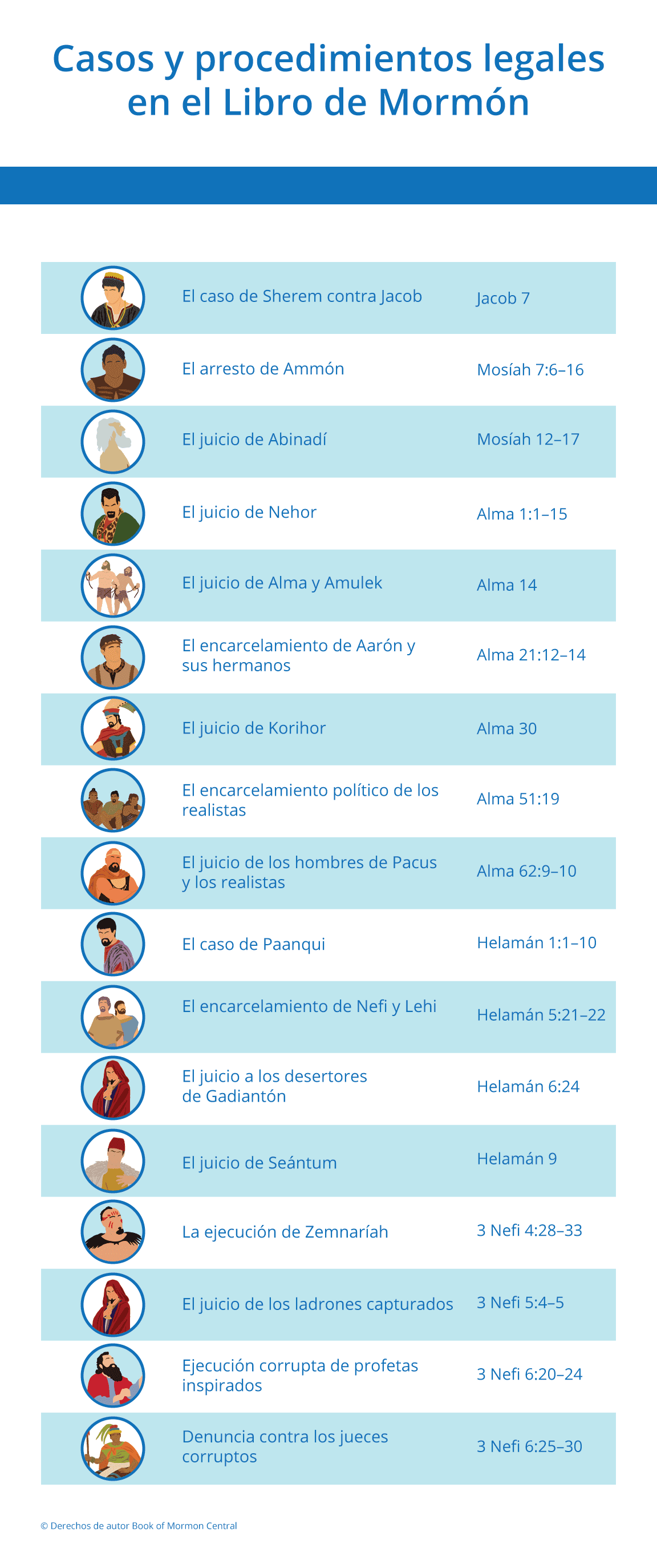 El propósito principal del Libro de Mormón es, por supuesto, religioso; pero sus páginas también reportan más de una docena de litigios o procedimientos legales importantes. Éste gráfico ayuda a los lectores a apreciar la cantidad y variedad de procedimientos legales informados en el Libro de Mormón. Éstos relatos discuten acusaciones, arrestos, encarcelamientos, ejecuciones, jueces, testigos y reglas de la ley. La mayoría de estos casos legales surgieron durante el tumultuoso gobierno de los jueces, cuando el papel del sistema judicial se había ampliado enormemente. Esos problemas enseñan lo importante que es para una sociedad libre y abierta honrar, obedecer y sostener la ley para poder sobrevivir y prosperar.