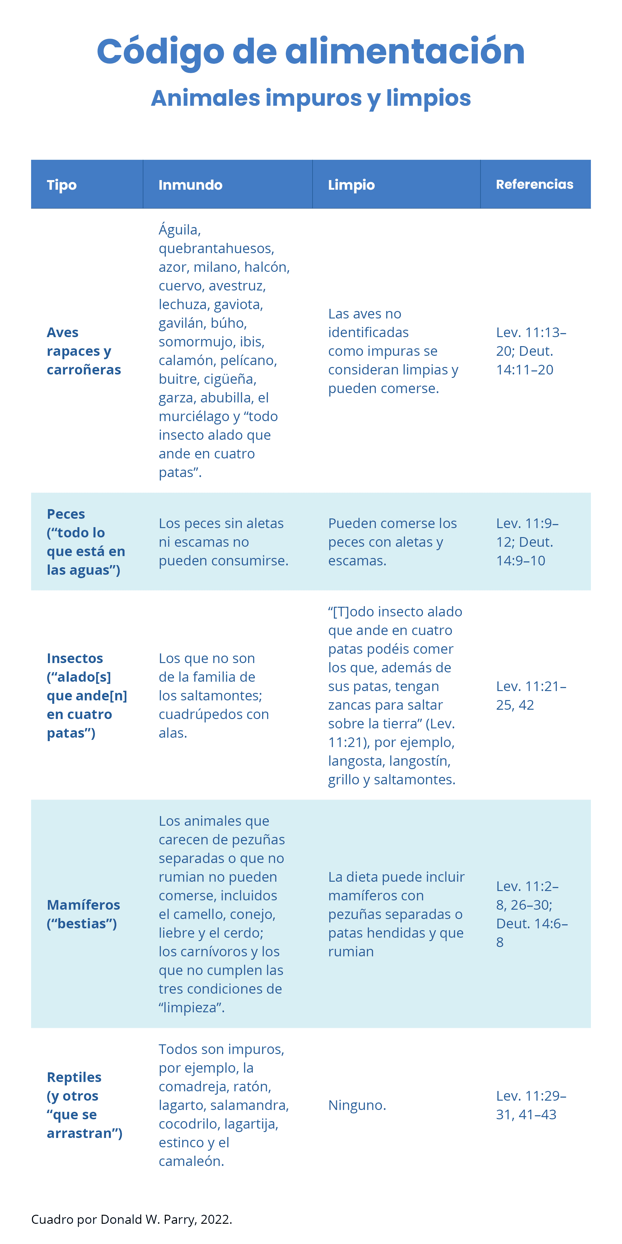 Jehová reveló a Moisés un código dietético estricto y específico sobre los animales impuros y limpios, que tenía propósitos tanto espirituales como temporales. Temporalmente, el código protegía a los israelitas de las enfermedades y de las prácticas económicas imprudentes. "La gran mayoría de los alimentos prohibidos [en la ley de Moisés] son aquellos que (1) son más propensos a portar enfermedades en el clima árido del desierto del Sinaí y/o la tierra de Canaán; o (2) son absurdamente antieconómicos para criar como alimento en el contexto agrario particular del desierto del Sinaí y/o la tierra de Canaán"[1].