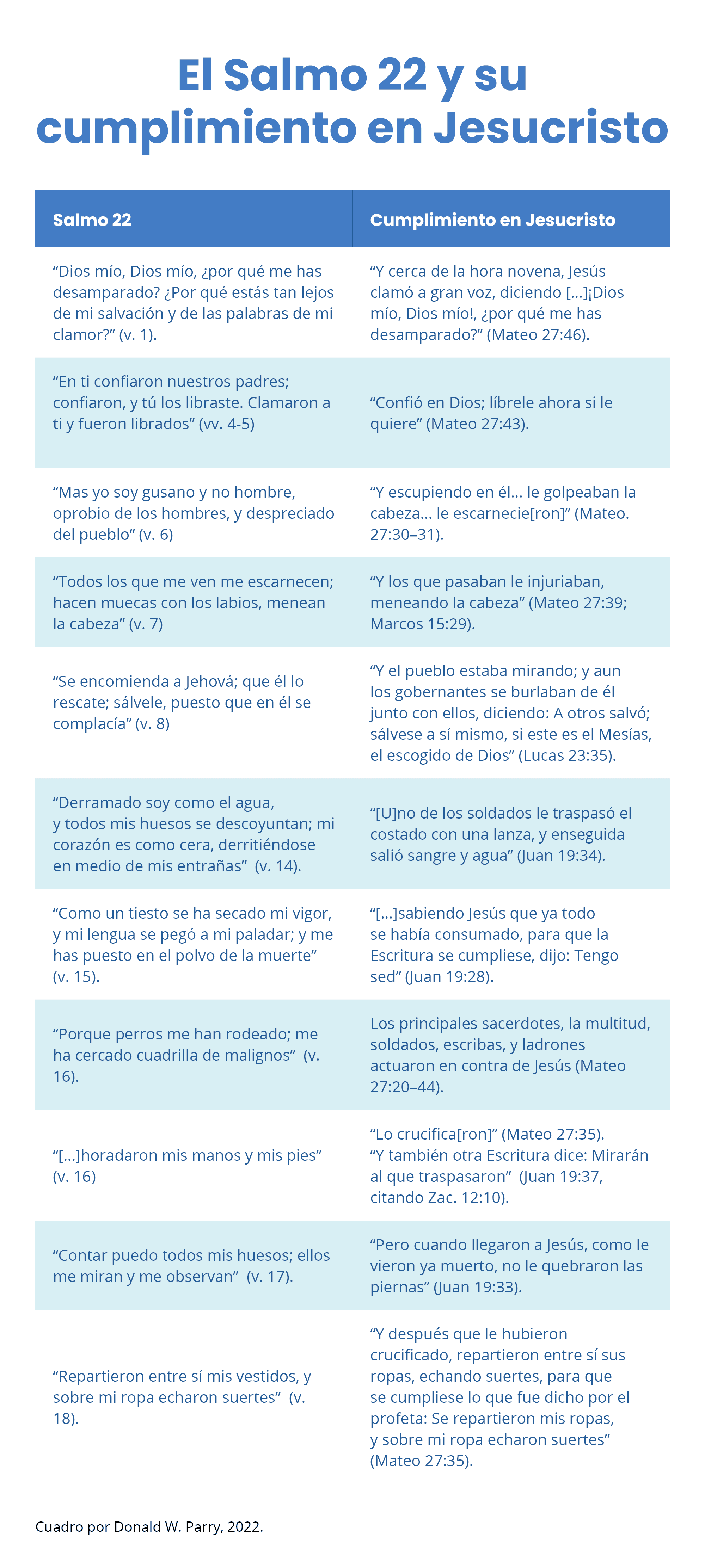 El Salmo 22 es una profecía notable con respecto a las últimas horas de Jesucristo en la mortalidad, cuando sufrió un intenso abuso seguido de la crucifixión. Véase el cuadro siguiente. El salmo describe el desprecio de la gente hacia Jesús cuando lo escarnecieron, se mofaron de Él y lo trataron como si no fuera más que un gusano. El salmo transmite las palabras exactas que Jesús pronunció mientras estaba en la cruz: "Dios mío, Dios mío, ¿por qué me has desamparado?" (v.1). Jesús pronunció estas palabras con "gran voz" (Mateo 27:46) o, según el salmo, con palabras de "clamor" (Salmo 22:1), como si las pronunciara un poderoso león. El salmo contiene una referencia explícita a la perforación de las manos y los pies de Jesús (v. 16) - "Horadaron mis manos y mis pies"- que se cumplió cuando Jesús fue crucificado.
