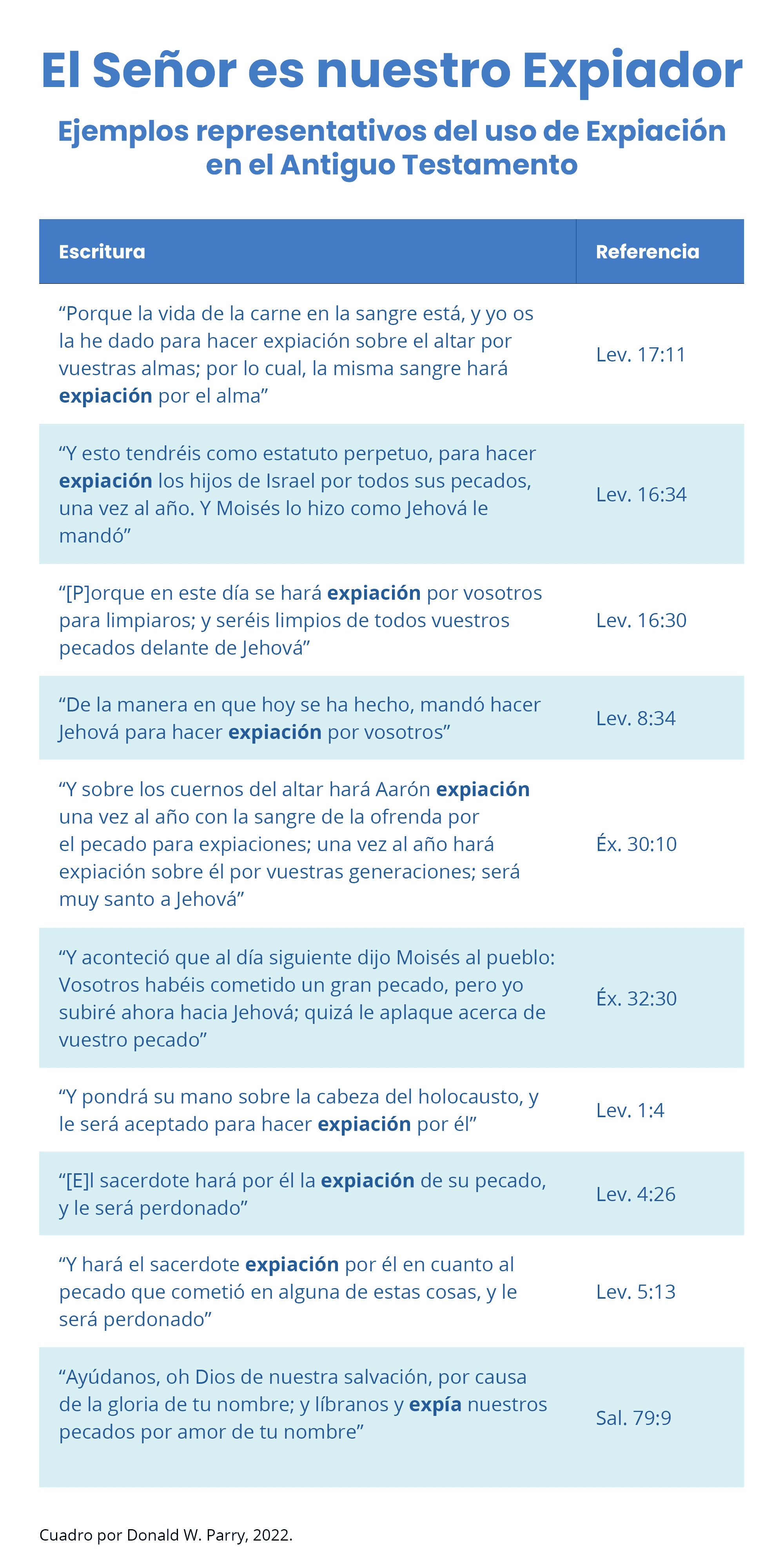 El Antiguo Testamento revela claramente que Jehová (=Señor) es el Gran Expiador. Y Jehová, por supuesto, no es otro que Jesucristo. Una y otra vez, Jehová ordenó a sus profetas o sacerdotes que hicieran una expiación por el pueblo. Además, las Escrituras colocan la palabra expiación (o sus formas afines) con las palabras Jehová, Dios, sangre, perdón, puro y pecado(s) y con otras palabras de importancia teológica (véanse, por ejemplo, los pasajes del cuadro). El Salmo 79:9 resume: "Ayúdanos, oh Dios de nuestra salvación, por causa de la gloria de tu nombre; y líbranos y expía [hebreo = expía] nuestros pecados, por amor de tu nombre".