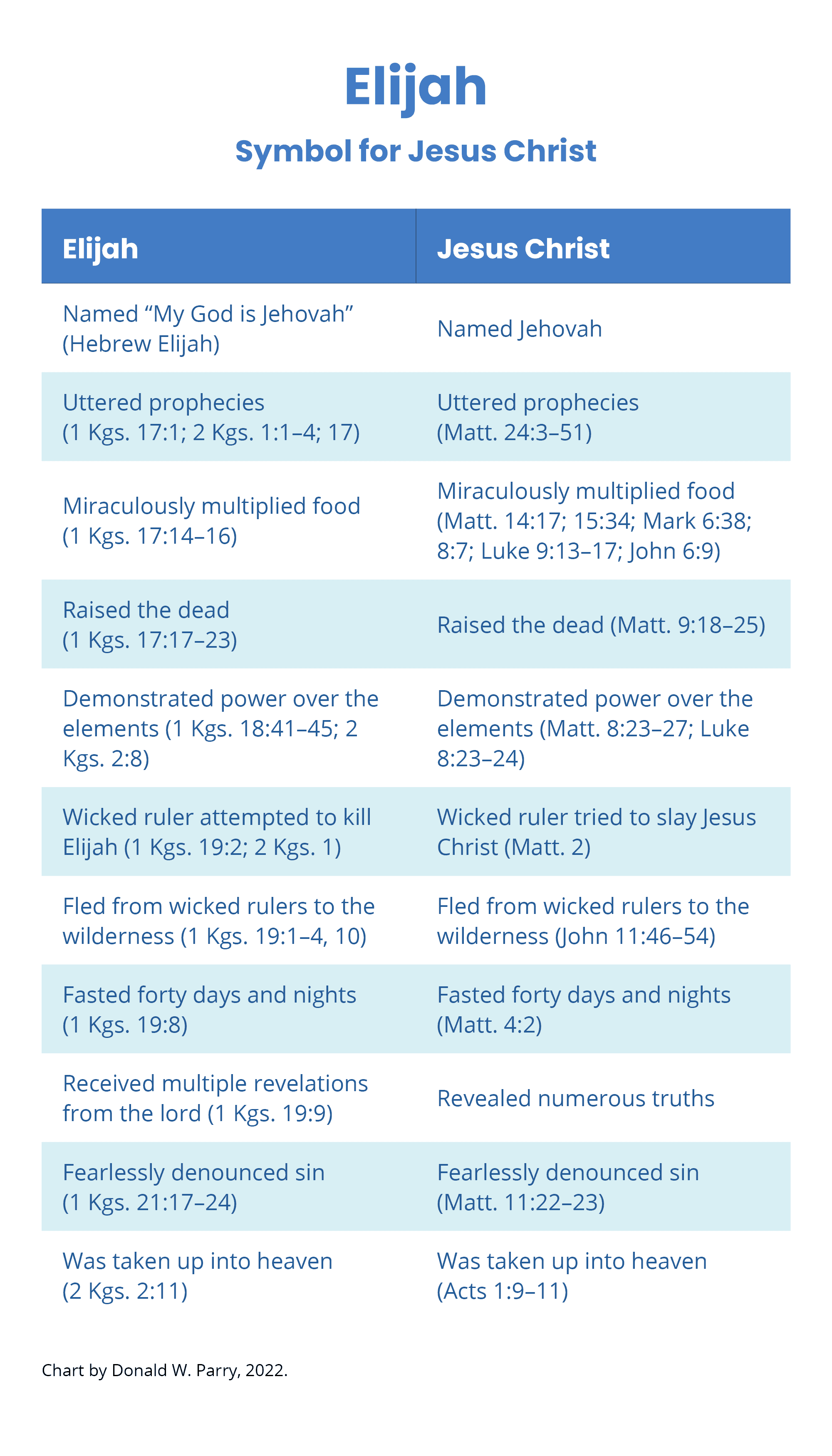 También Elías sirve como tipo y sombra de Jesucristo. Por ejemplo, Elías fue llevado al cielo: "un carro de fuego con caballos de fuego […] y Elías subió al cielo en un torbellino" (2 Reyes 2:11). También Jesús fue llevado al cielo. Lucas registró, “Y habiendo dicho estas cosas[Jesús], viéndolo ellos [Sus Apóstoles], fue alzado; y le recibió una nube que le ocultó de sus ojos. Y estando ellos con los ojos puestos en el cielo, entretanto que él se iba, he aquí se pusieron junto a ellos dos varones vestidos de blanco, los que también les dijeron: Varones galileos, ¿por qué estáis mirando al cielo? Este mismo Jesús, que ha sido llevado de entre vosotros arriba al cielo, así vendrá como le habéis visto ir al cielo” (Hech. 1:9–11). Este es solo un ejemplo. En el cuadro se enumeran otros ejemplos.