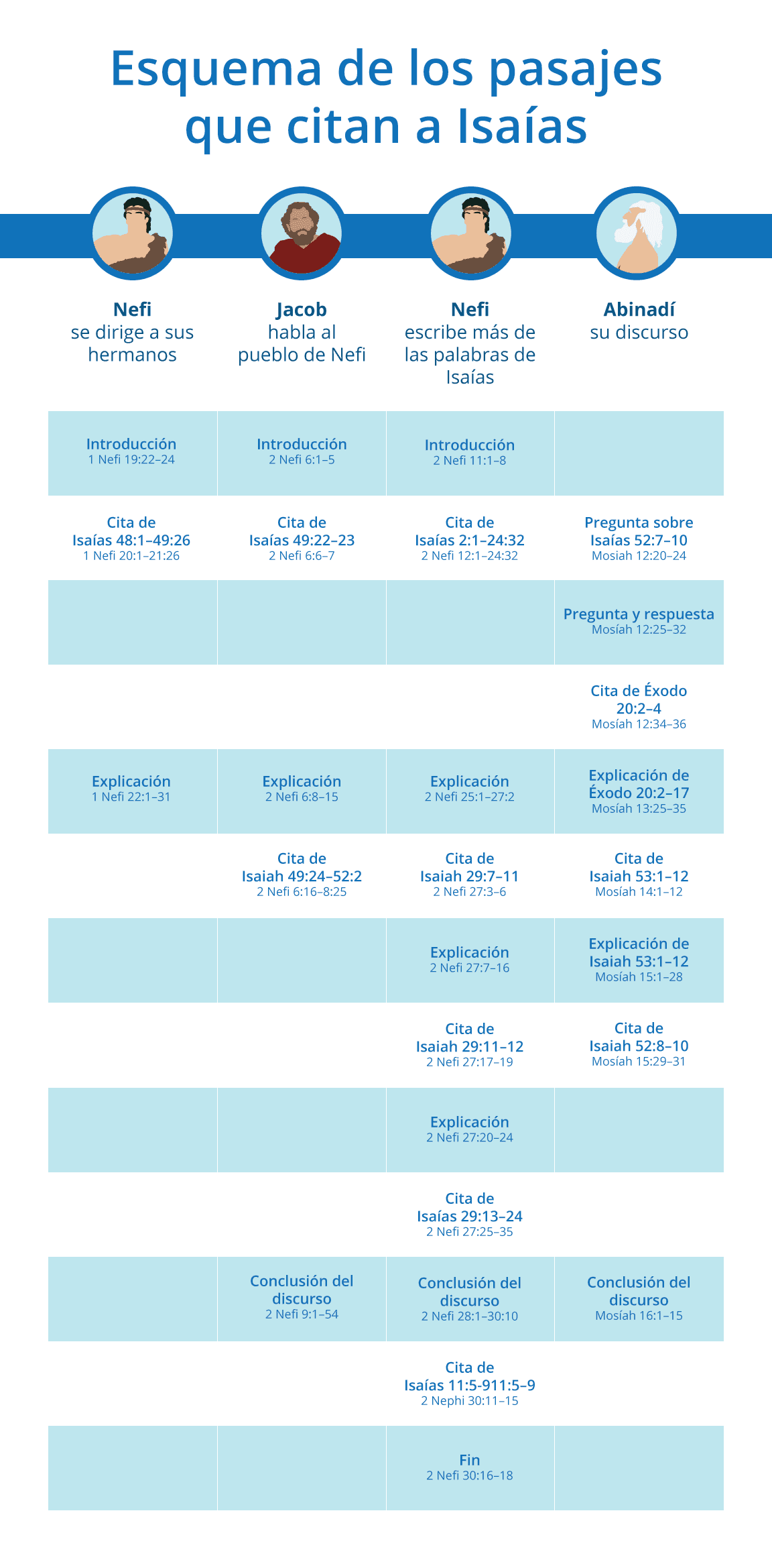 Cuando los profetas nefitas citaron a Isaías, usaron una fórmula de citas por partes, que generalmente consiste en una introducción, una cita, una explicación de la cita y una conclusión. Éste gráfico describe las estructuras de los cuatro pasajes principales de las Escrituras en los que los profetas del Libro de Mormón citan ampliamente a Isaías. Aunque cada pasaje varía ligeramente de la fórmula de cita de cuatro partes, el patrón es definido, lo que ayuda a los lectores a seguir los pensamientos de Isaías y hacer un buen uso de las explicaciones proporcionadas por Nefi, Jacob y Abinadí.
