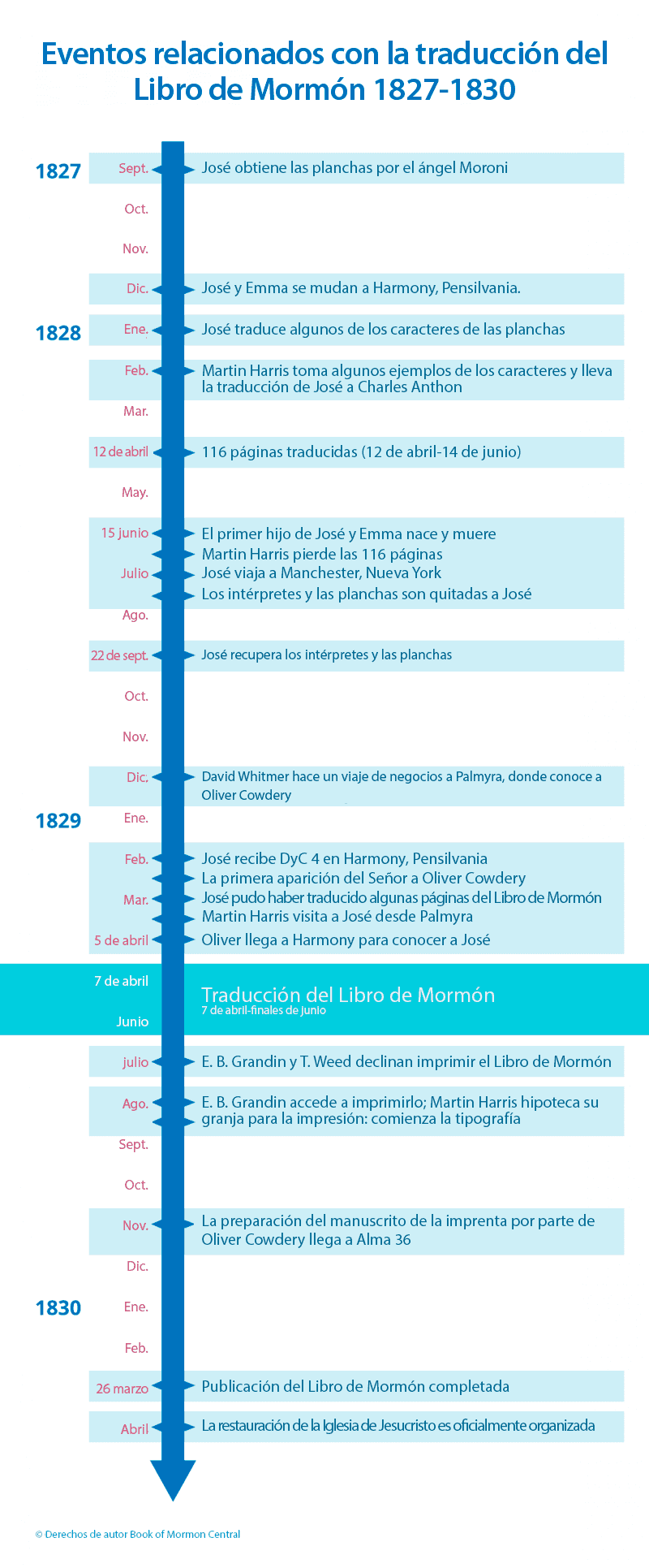 Este gráfico resalta los eventos importantes que fueron fundamentales para ayudar a sacar a luz el Libro de Mormón. También representa algunos de los sacrificios que se requirieron para completar esta gran tarea. Conocer el orden y el momento de estos eventos puede ayudar a los lectores a apreciar mejor el ritmo milagrosamente rápido en que el Libro de Mormón fue traducido y publicado.