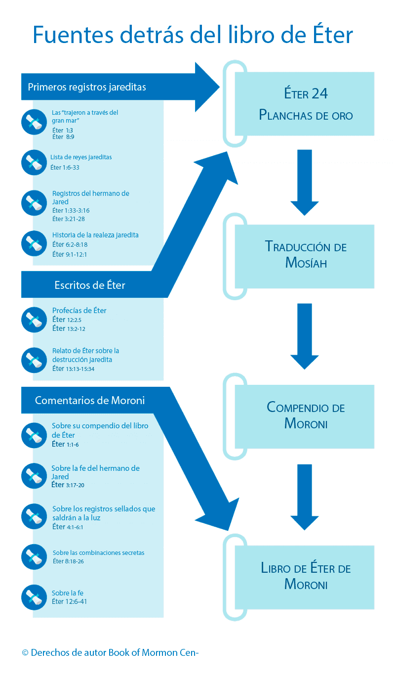 Lo que ahora conocemos como el libro de Éter se originó a partir de los primeros registros jareditas y de los escritos de Éter, los cuales combinó para producir las veinticuatro planchas de oro cerca del final de la civilización jaredita. El pueblo de Limhi más tarde encontró estas planchas mientras buscaban la ciudad de Zarahemla y el rey Mosíah las tradujo alrededor del año 120 a. C. Moroni más tarde compendió las planchas traducidas y, junto con sus comentarios, las incluyó en su registro, produciendo así la forma final del libro de Éter. La unión entre estas dos intersecciones de los comentarios de Moroni al texto final de este libro son claramente discernibles, con el texto subyacente resumiendo impecablemente cada interrupción.