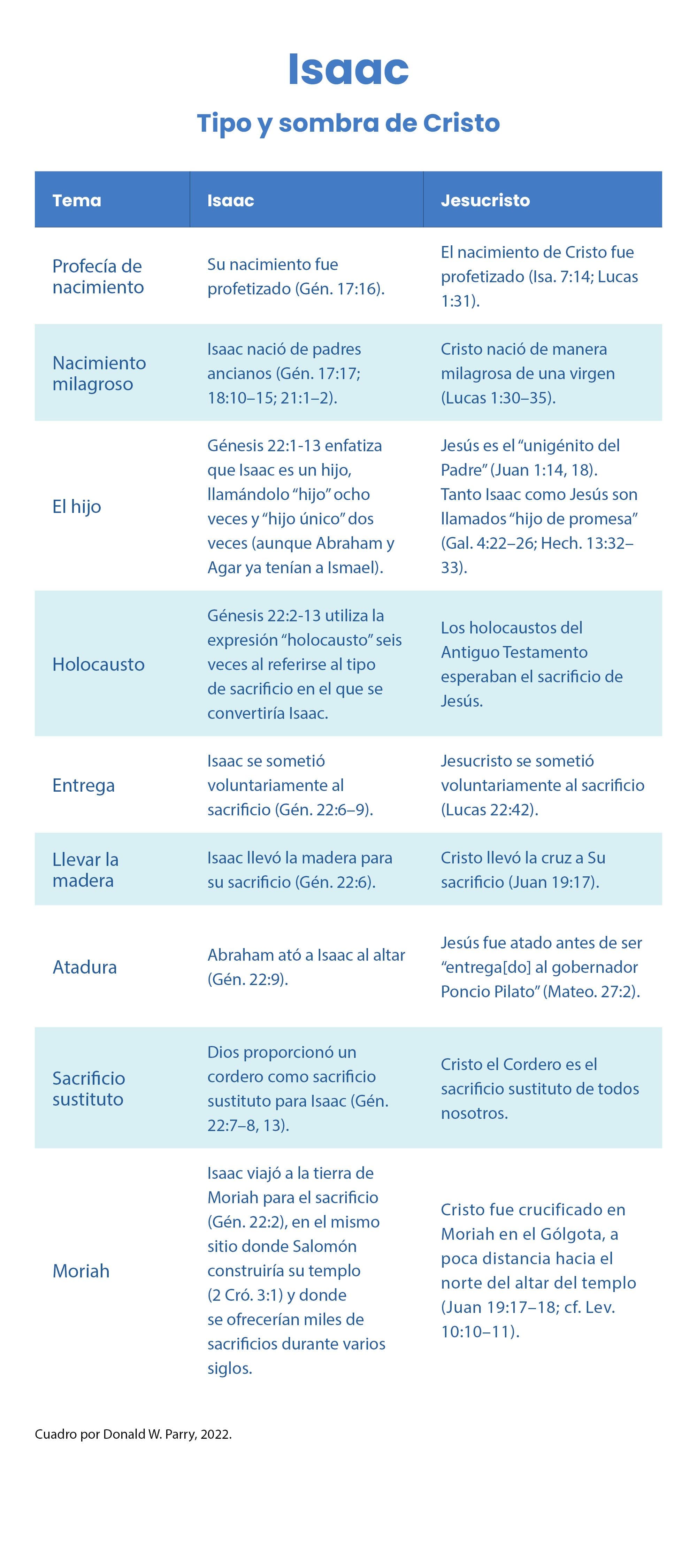 Hay una serie de paralelos sorprendentes y significativos entre Isaac y Jesús que demuestran que Isaac era un tipo de Jesucristo y Su sacrificio, como se indica en el cuadro adjunto.