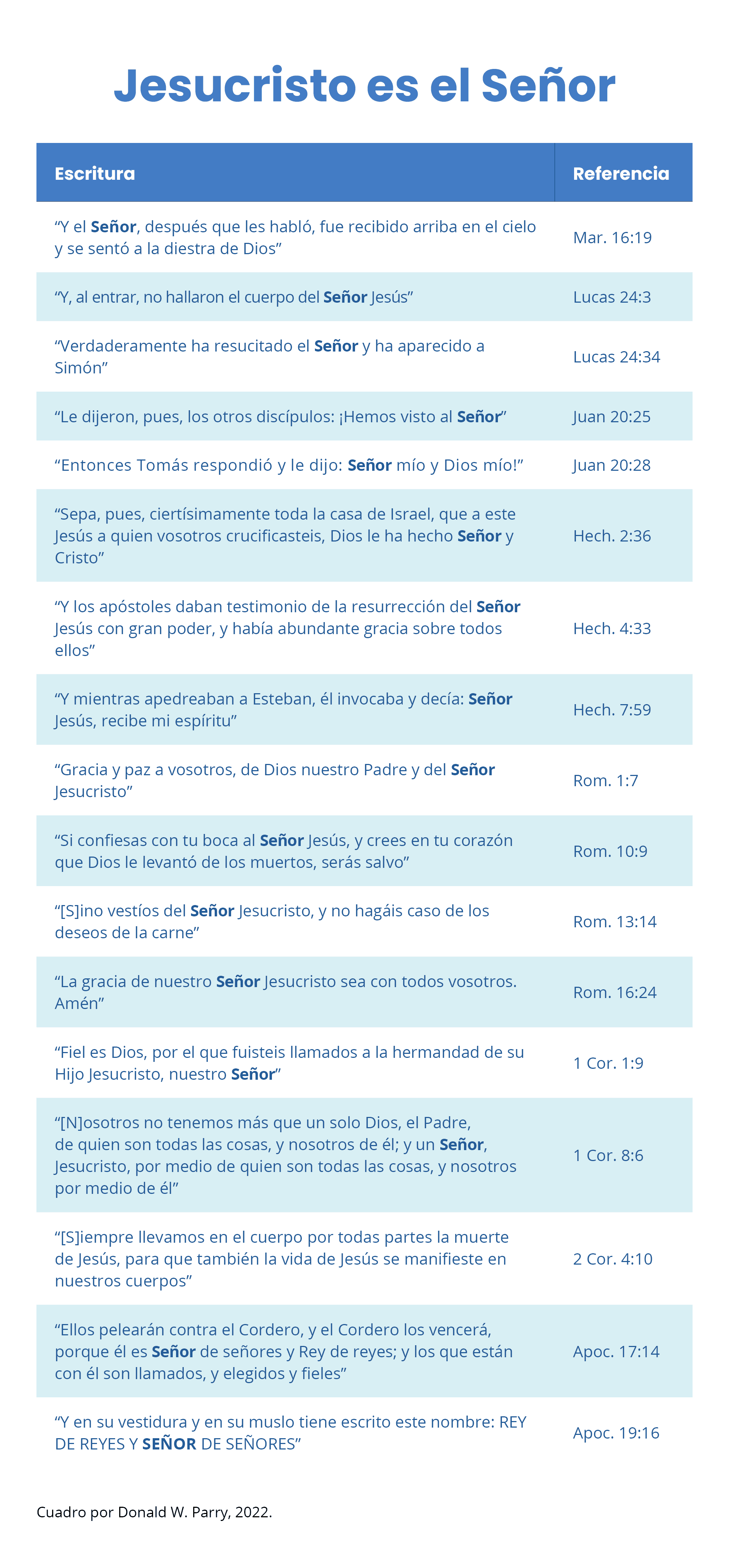 Dos veces Juan el Revelador testificó que Jesucristo es el "Señor de los señores" (Ap. 17:14; 19:16), y Pablo escribió tres doctrinas significativas -resurrección, expiación y vida eterna- en relación con Jesucristo el Señor: (1) " Porque Cristo para esto murió, y resucitó y volvió a vivir, para ser Señor tanto de los muertos como de los que viven" (Rom. 14:9); (2) " Y no solo esto, sino que también nos gloriamos en Dios por medio del Señor nuestro Jesucristo, por quien hemos recibido ahora la reconciliación" (Rom. 5:11); y (3) "para que así como el pecado reinó para muerte, así también la gracia reine por la justicia para vida eterna por medio de Jesucristo, nuestro Señor" (Rom. 5:21).
