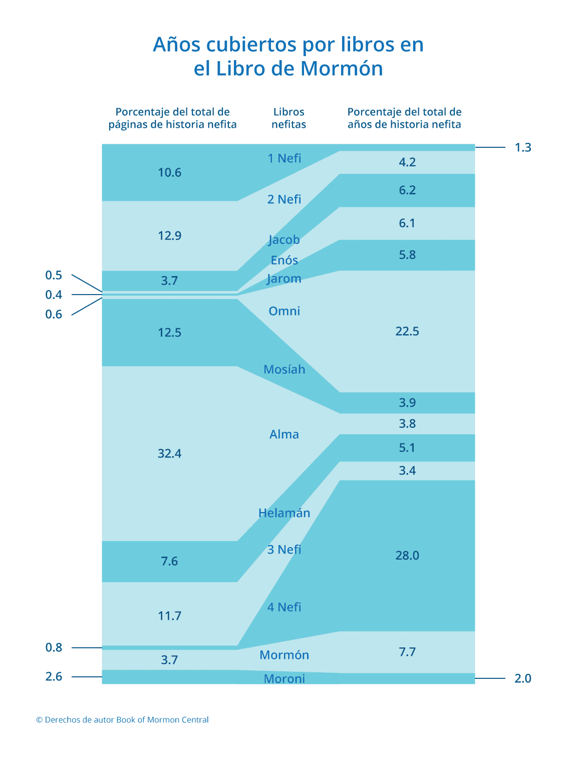 Esta tabla resalta la relación entre las páginas escritas y los años registrados por los libros individuales en el Libro de Mormón. Por ejemplo, mientras que 4 Nefi solamente son pocas páginas y representan el 8% del número total de las páginas del Libro de Mormón que registra la historia nefita, registra cuatro generaciones de personas y cubre el 28% de los años en los que la civilización nefita existió. El libro de Éter no fue incluido ya que cubre la historia jaredita en lugar de la historia nefita.