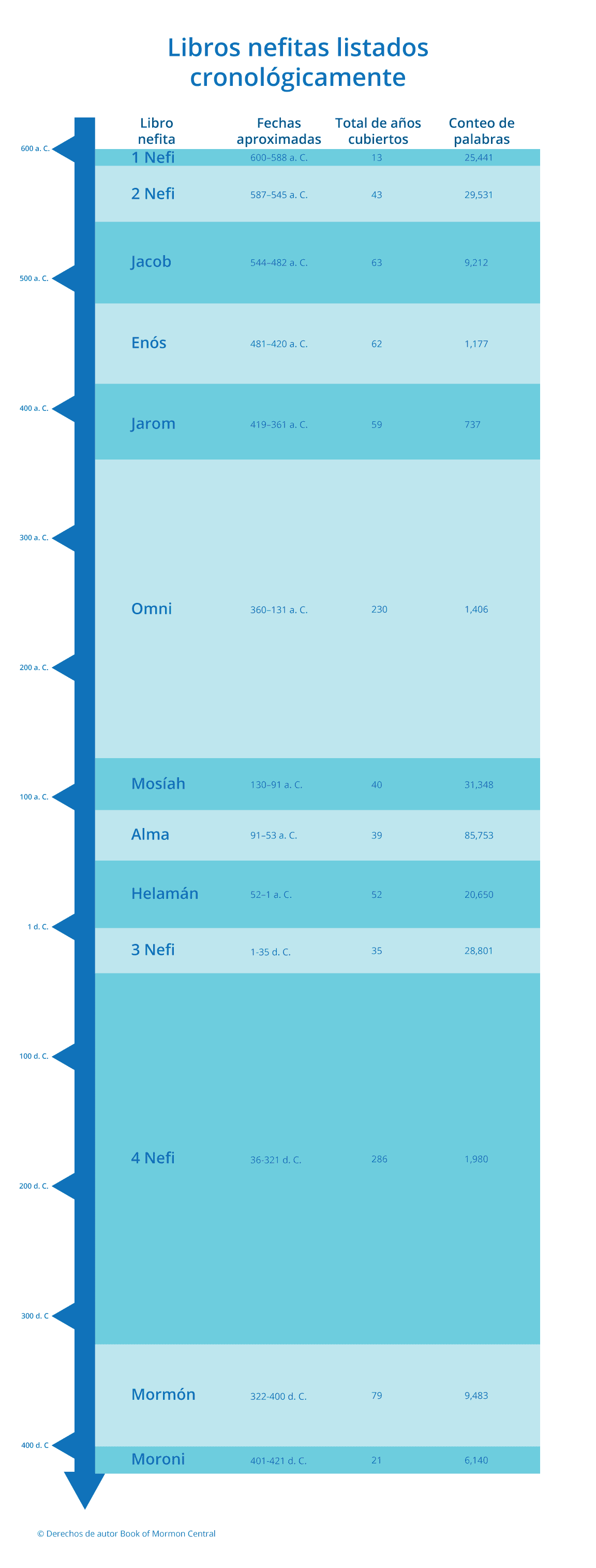 Los nefitas vivieron en las Américas desde aproximadamente 600 años a. C. hasta el año 385 d. C., un período de alrededor mil años. Moroni sobrevivió a su pueblo y enterró las planchas alrededor del año 421 d. C. Esta gráfica demuestra dónde encaja cada libro nefita dentro de la cronología nefita en su conjunto. También permite a los lectores comparar rápidamente la cantidad de palabras contra el total de tiempo cubierto por cada libro. Tres periodos de la civilización nefita recibieron la mayor atención: el establecimiento (siglo VI a. C.), el florecimiento (150 a. C. a 50 d. C.) y los años finales (siglo IV d. C.).