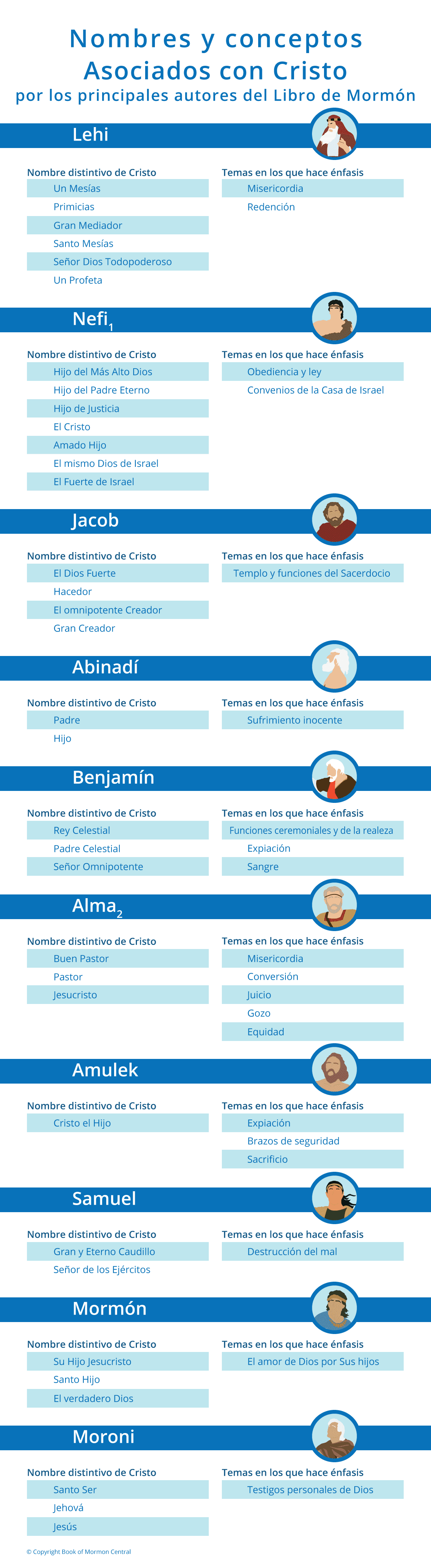 Los escritos de los principales autores del Libro de Mormón reflejan una comprensión y testimonio personal de Jesucristo. Esto es evidente en parte por los nombres únicos que utilizaron para describirlo, los cuales se pueden encontrar a la izquierda de esta tabla. La columna de la derecha enumera algunos de los temas principales que cada autor enfatizó en sus mensajes. Esos temas generalmente están en consonancia con los nombres que cada autor utiliza para Cristo.