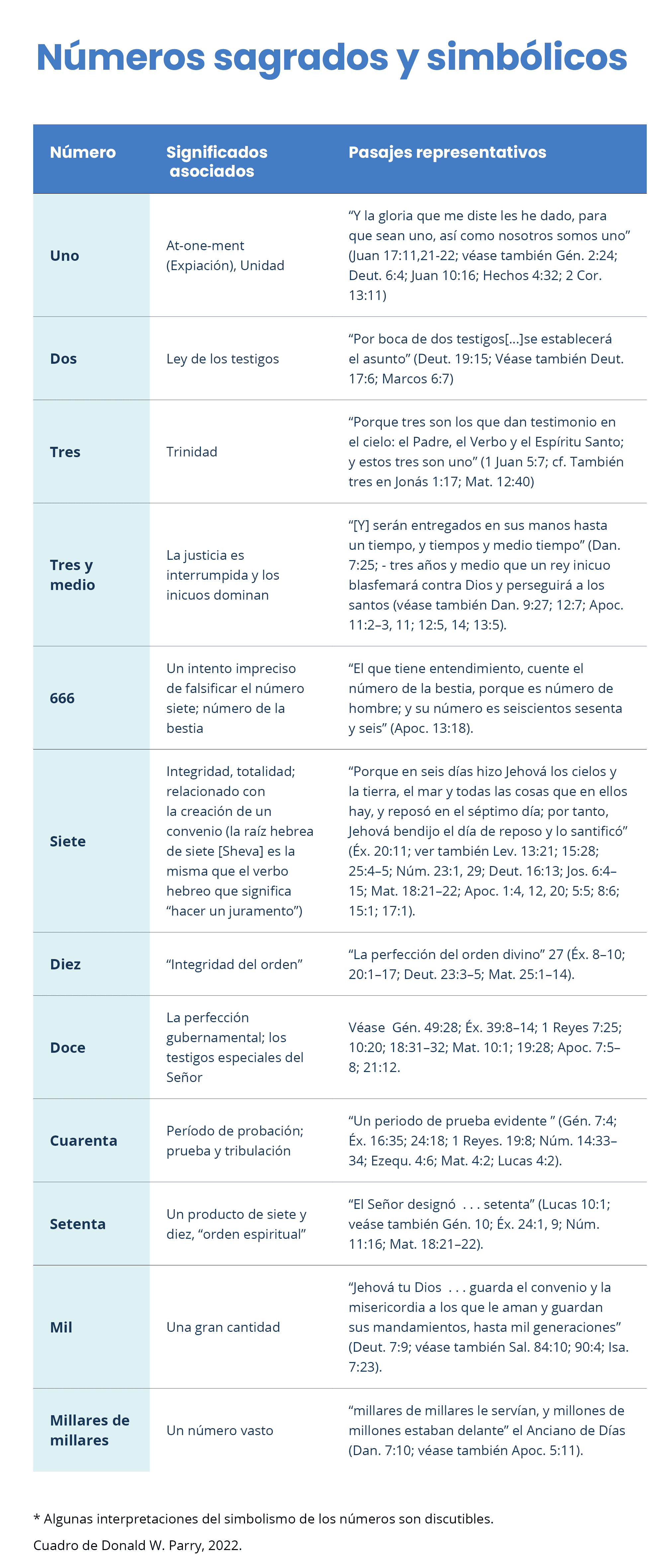 Este cuadro presenta varios números que se utilizan simbólicamente, junto con sus posibles significados y algunos pasajes representativos. Los lectores de las escrituras deben tener precaución y no intentar aplicar valores simbólicos a todos los números o incluso a la mayoría de ellos. Como se ha indicado anteriormente, el uso convencional en las escrituras es, sin duda, el empleo más frecuente de los números. Aplicar un significado simbólico a un número cuando no se pretende ninguno afectará negativamente el entendimiento del pasaje bíblico que se está estudiando.