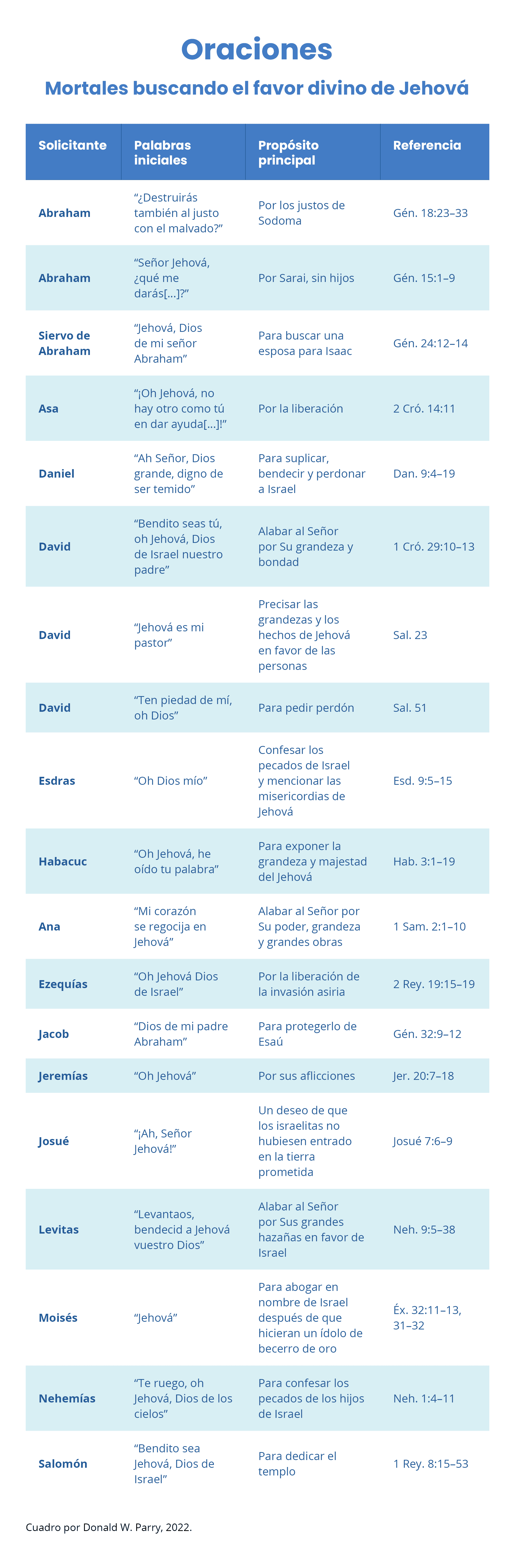 El cuadro presenta varias oraciones del Antiguo Testamento; las columnas indican el nombre del solicitante (columna 1, ordenada alfabéticamente), las palabras iniciales de la oración (columna 2), el objetivo principal de la oración (columna 3) y la referencia bíblica (columna 4).