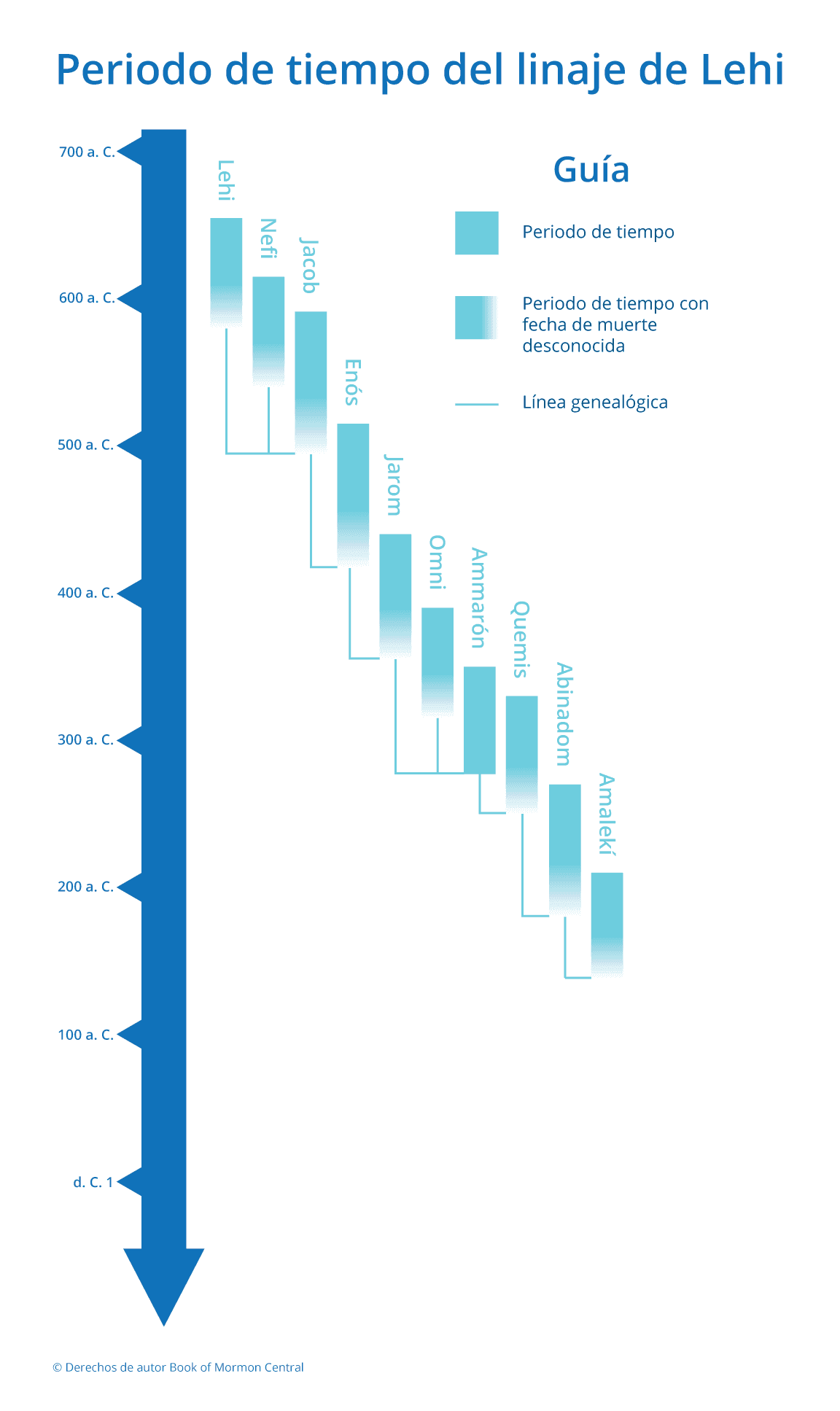 Esta tabla muestra el linaje de Lehi y el periodo de tiempo aproximado de él y sus descendientes, desde Nefi hasta Amalekí, quien fue el responsable de guardar los registros históricos y doctrinales de su pueblo.