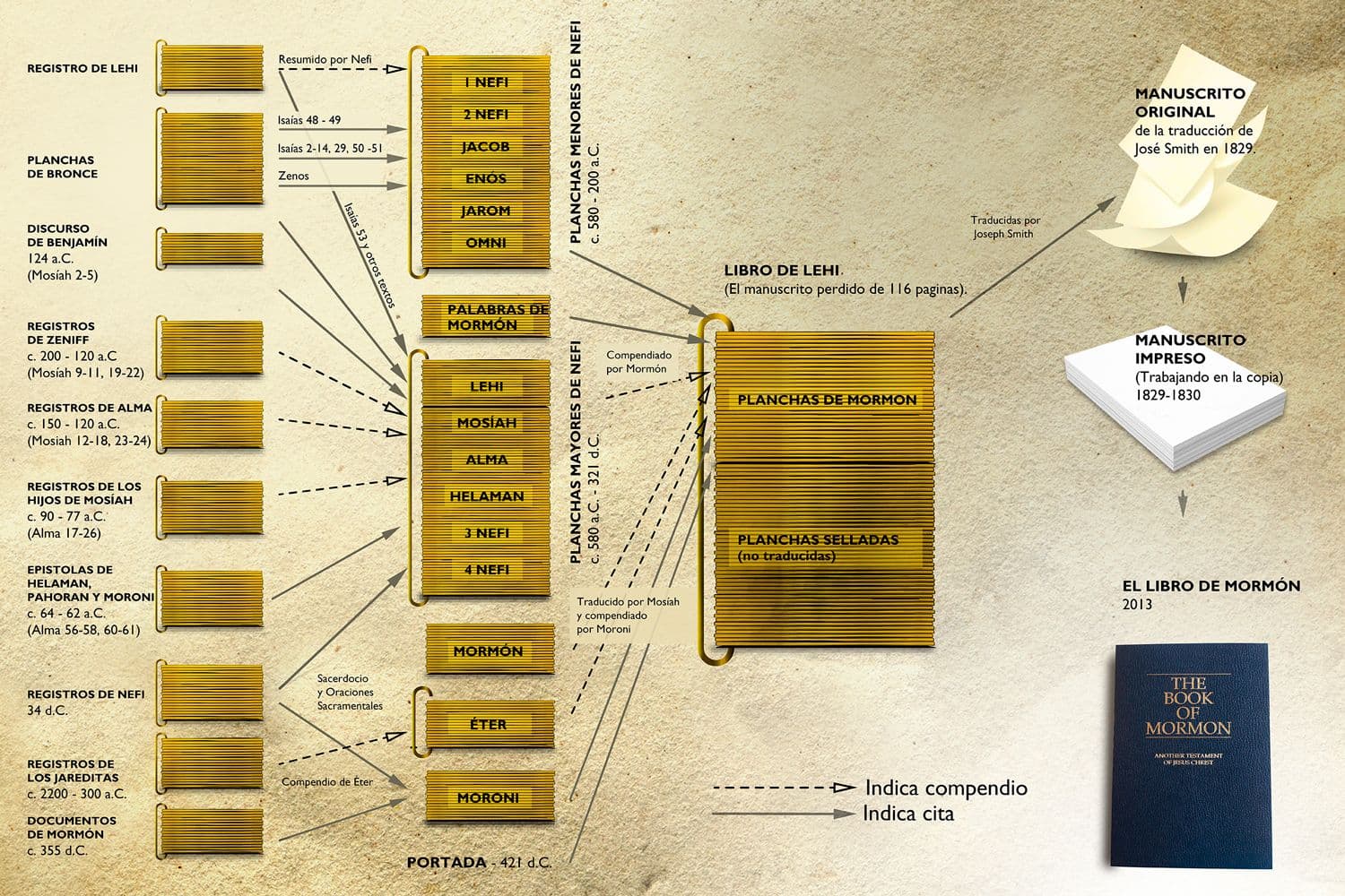 Las columnas izquierda y central de este gráfico muestran cómo los antiguos resúmenes, citas y escritos originales de los autores del Libro de Mormón terminaron en las Planchas de Mormón. Cuando José Smith tradujo estas planchas, sus escribas registraron su dictado sobre lo que se denomina como el manuscrito original. Oliver Cowdery luego hizo una copia del manuscrito original, y es a partir de esta copia, conocida como el manuscrito de la imprenta, que la primera edición del Libro de Mormón fue tipografiada y publicada.