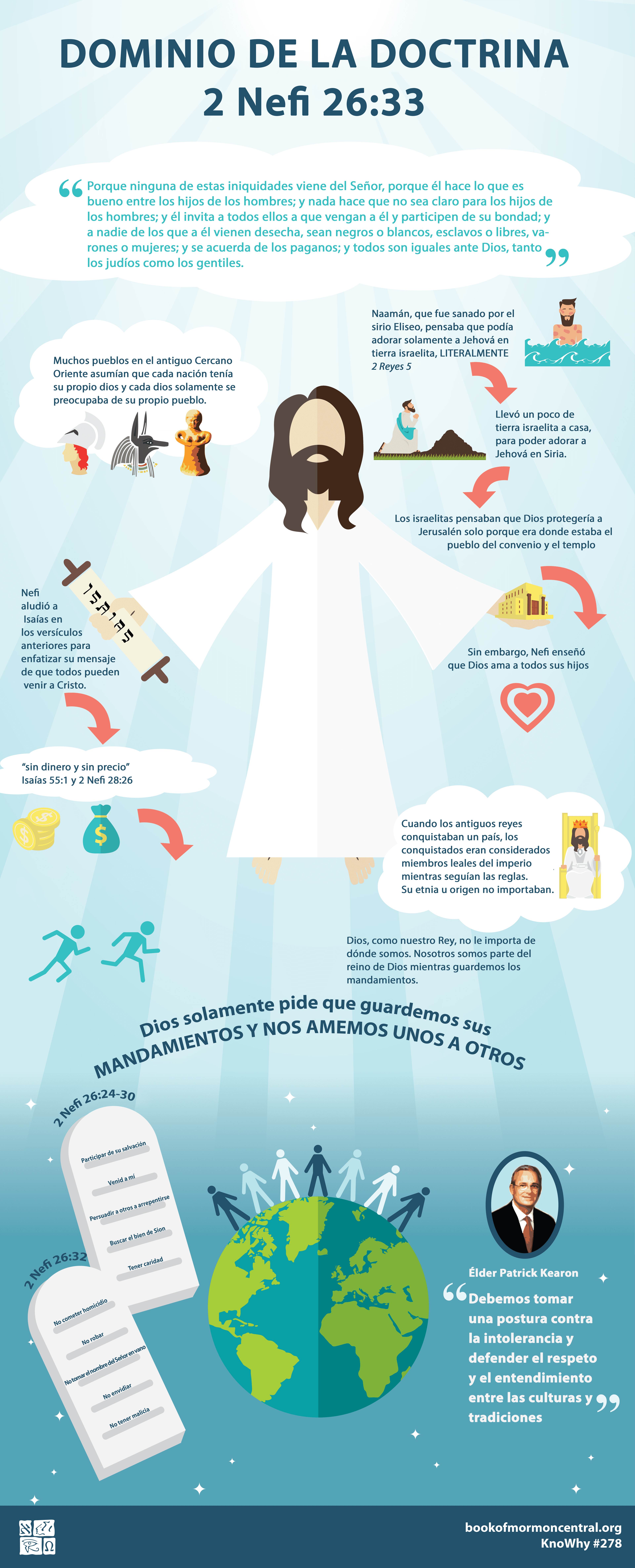 2 Nefi 26:33 dice que "todos son semejantes a Dios, tanto judíos como gentiles". La mayoría de las personas en el tiempo de Nefi asumieron que los dioses de cada nación solo amaban a su propia nación. Nefi enseñó lo contrario. También mostró que los gentiles aceptarían con entusiasmo a Jehová como su Dios. Esto tendría lugar porque Dios simplemente establece las condiciones que las personas deben cumplir para que Él las acepte, y aquellos que guardan Sus mandamientos se convierten en parte de Su reino, como fue el caso de los antiguos reyes que establecieron condiciones para sus súbditos. No es de donde la gente es lo que importa para Dios, es lo que hacen.