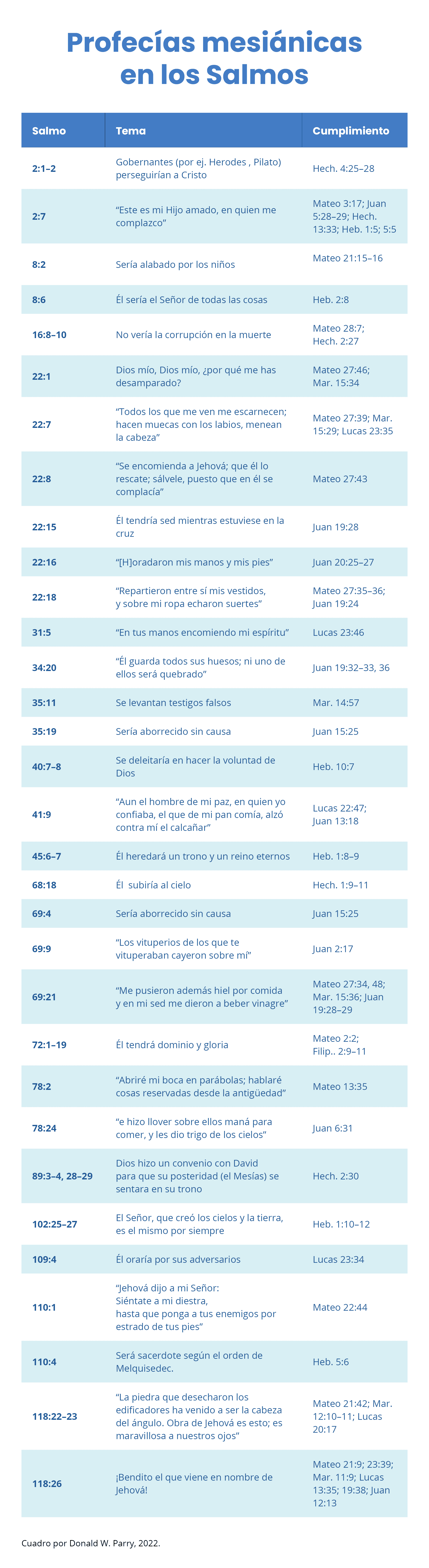 El cuadro anexo presenta pasajes del tercer grupo mencionado por Jesús, el de los Salmos. La columna 1 proporciona la referencia de los Salmos citados, parafraseados o aludidos en el Nuevo Testamento. En la columna 2 se expone el tema o una declaración resumida del contenido del pasaje, y en la columna 3 se proporciona el o los pasajes pertinentes del Nuevo Testamento. El Salmo 22, por ejemplo, contiene varios pasajes relacionados con el sufrimiento de Jesús y Su crucifixión.