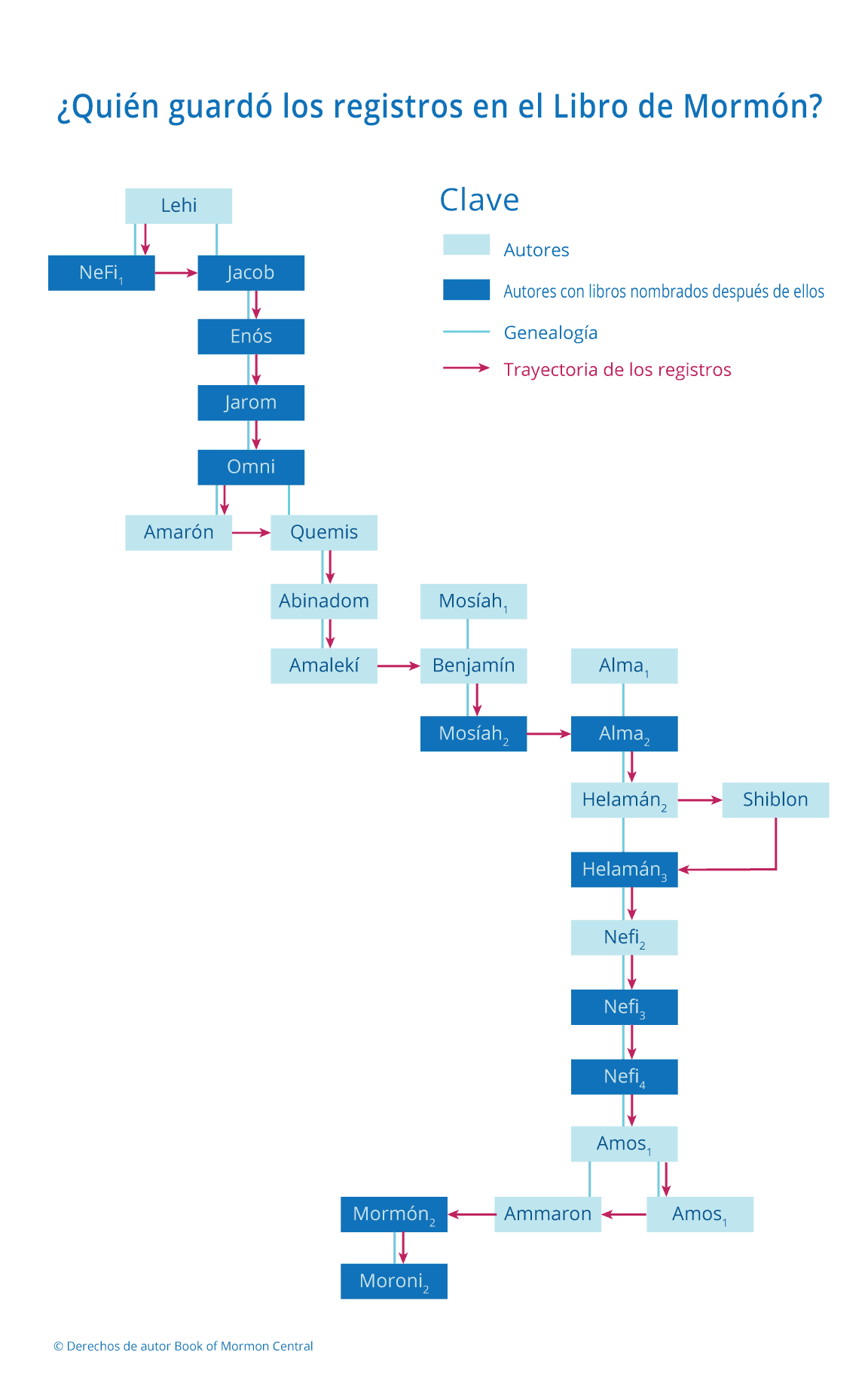 Los registros genealógicos, históricos, legales y proféticos de los nefitas fueron transmitidos con un deber sagrado, usualmente de padres a hijos. Solamente cuatro familias nefitas tenían las planchas: la posteridad de Lehi principalmente por Jacob, la familia de Mosíah, Alma y su larga línea de descendientes y Mormón y su hijo Moroni. Como el antropólogo John L. Sorenson ha señalado, el Libro de Mormón está estructurado como un “linaje histórico”.