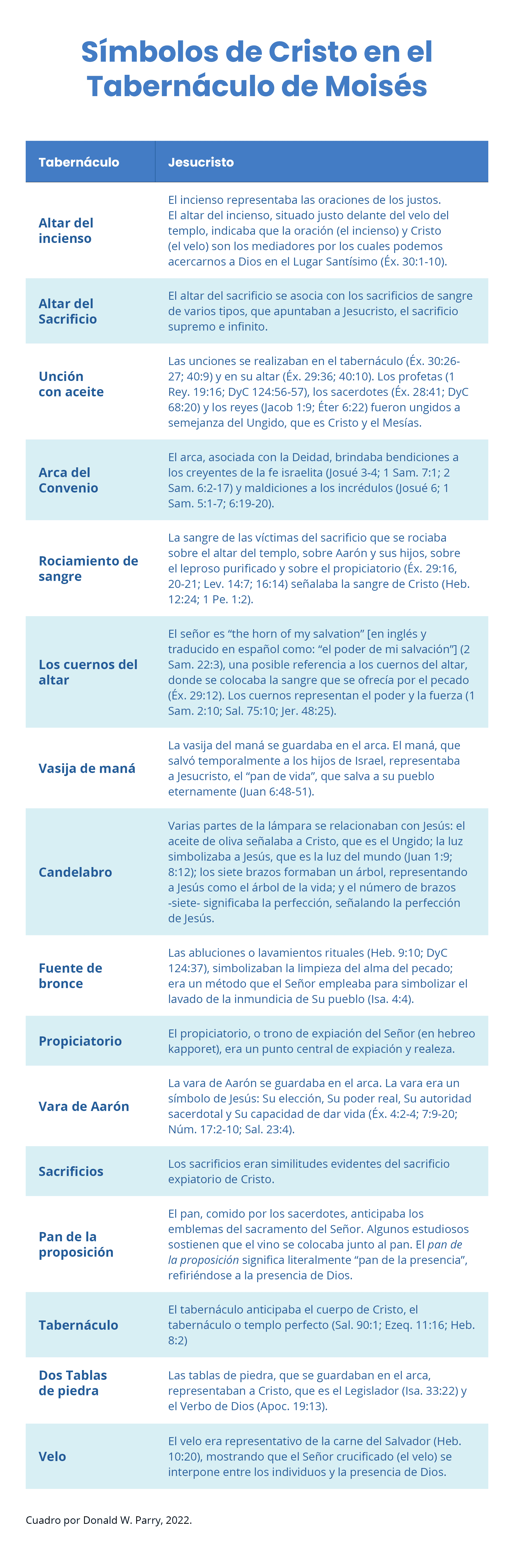 Varios componentes del tabernáculo prefiguran aspectos del ministerio divino y del sacrificio expiatorio de Jesucristo. Estos componentes incluyen el mobiliario del tabernáculo (fuente de bronce, altares, candelabro, arca del convenio), los sacrificios (holocausto, paz, pecado, ofrendas expiatorias), alimentos (porciones de ofrendas de sacrificio, panes de la proposición), objetos sagrados (vasija de maná, tablas de la ley, vara de Aarón), y diversas partes del tabernáculo (velo, cuernos del altar). Los rituales y actos (es decir, las unciones, los lavados, derramamiento de sangre y la imposición de manos) tipificaban a Jesucristo y Su misión.