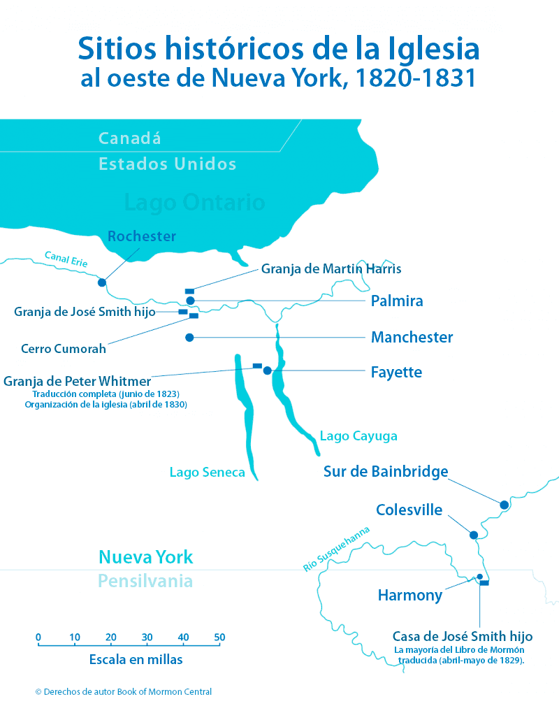 Este mapa de Nueva York y Pennsylvania resalta los lugares vinculados con el Libro de Mormón y el establecimiento de la iglesia restaurada de la iglesia de Jesucristo. Al huir de la persecución, José Smith y Emma dejaron Manchester en diciembre de 1827 y se establecieron en Harmony donde José traduciría la mayoría de las planchas. En junio de 1829, José, Oliver y (más tarde) Emma se cambiaron a la casa de los Whitmer en Fayette donde a los tres testigos se les mostraron las planchas, la traducción se completó y la iglesia fue organizada el 6 de abril de 1830. Otros sitios notables incluyen South Bainbridge, donde José y Emma se casaron; el lago Seneca, donde varias personas fueron bautizadas durante los primeros años de la restauración; y Colesville, donde la primera rama de la iglesia se formó.