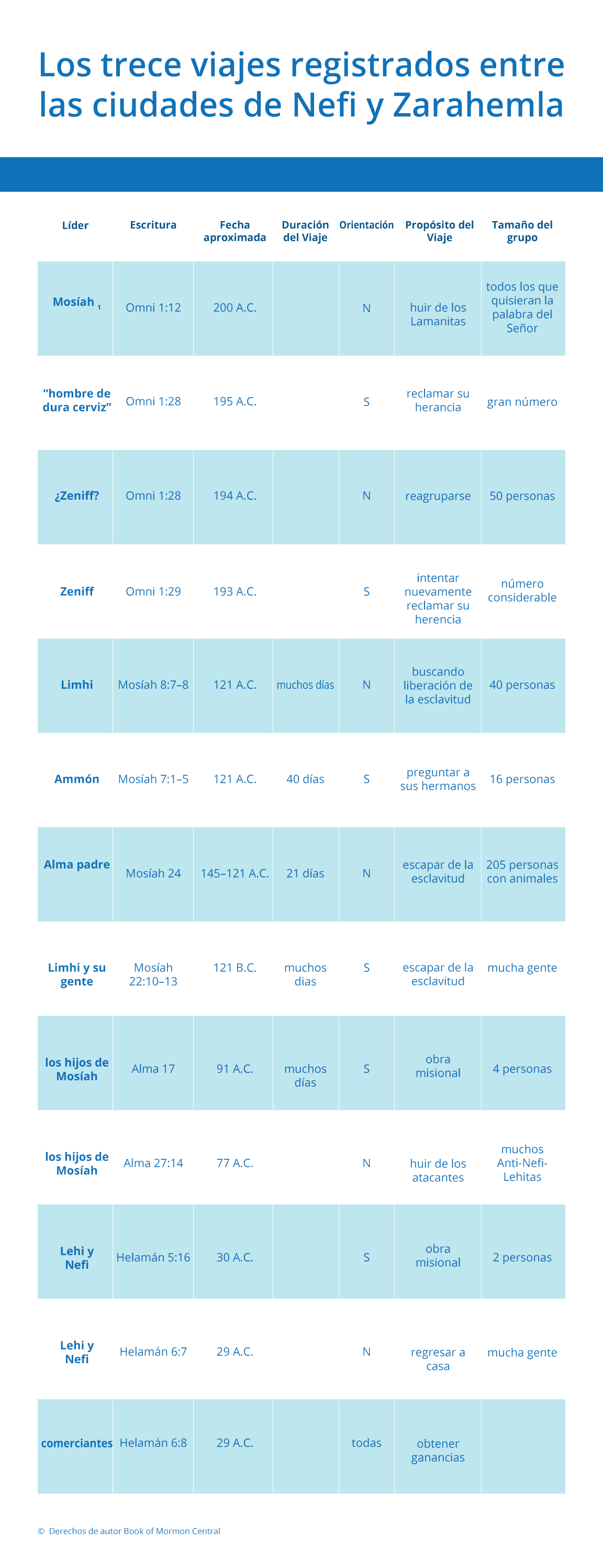 Esta tabla enumera los trece viajes registrados entre las ciudades de Nefi y Zarahemla, así como otra información pertinente, como las fechas, propósitos y líderes de las expediciones. El objetivo de muchos de estos viajes era buscar seguridad en otra parte de la tierra. Otros viajes a lo largo de esta ruta fueron hechos con fines misionales. Al parecer, este viaje se convirtió en algo común, y la carretera se convirtió en una vía principal, ya que los comerciantes en el 29 a.C. viajaban de un lado a otro para vender sus productos (véase Helamán 6:8).