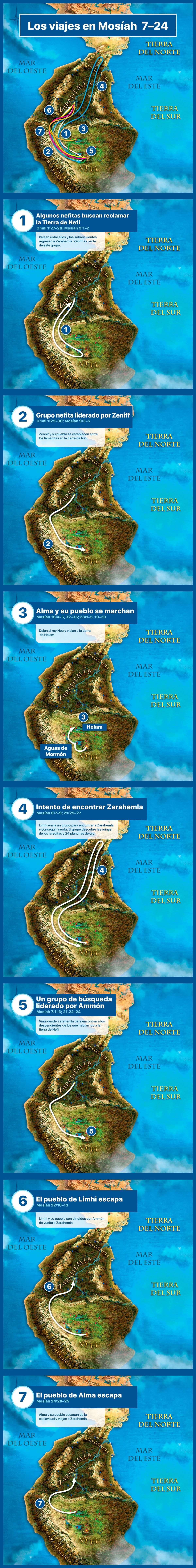 ¡Estos capítulos pueden ser confusos! Desde Mosíah 7-24, hay bastantes viajes y retrocesos diferentes entre la tierra de Zarahemla y la tierra de Nefi. He reunido algunos diagramas para ayudar a saber cuándo y dónde tiene lugar cada viaje.