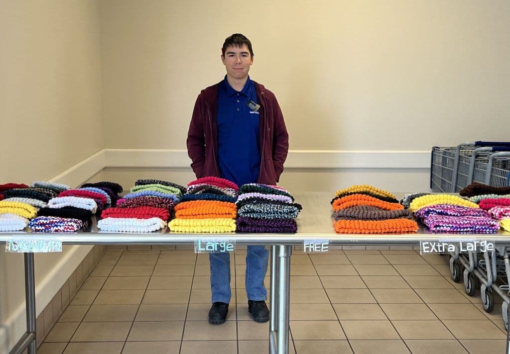 Aquellos que se enfrentan a la inseguridad alimentaria y que acuden al Almacén del obispo de Springville pueden pasar junto a una mesa donde se hace entrega de gorros y bufandas tejidos a mano por el élder Hallock, de 22 años, del Barrio Provo 2 de la Estaca Provo Sur, Utah. El miércoles, 30 de noviembre fue el último día de su servicio — durante el cual hizo más de 1000 gorros y más de 100 bufandas.