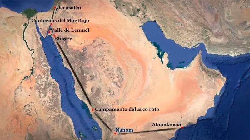 Siete lugares notables se mencionan específicamente en 1 Nefi como puntos a lo largo del viaje de Lehi: Jerusalén (1 Nefi 1:4), los "contornos del mar Rojo" (1 Nefi 2:6), el Valle de Lemuel (1 Nefi 2:8), Shazer (1 Nefi 16:13), el campamento del arco roto (1 Nefi 16:17–18), Nahom (1 Nefi 16:34), y Abundancia (1 Nefi 17:5).