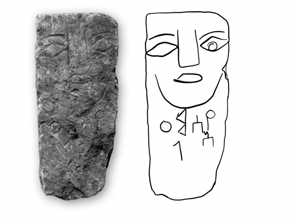 Es digno mencionar, por tanto, que en 2008 un corpus de más de 400 estelas funerarias toscamente talladas recuperadas de Wadi Jawf fueron publicadas por el Museo Nacional de Saná5. Estas estelas tienen rasgos faciales antropomórficos tallados sobre una inscripción del nombre del difunto. Éste es un estilo de estela funeraria panárabe, con este corpus particular que presenta algunas variaciones regionales distintivas y exclusivas del Wadi Jawf6. Entre ellas se encuentra una estela funeraria de 30 x 12.5 x 7.5 cms. de piedra caliza con el boceto de una cara toscamente grabada (ojos, nariz, boca y línea maxilar), debajo de la cual está inscrito el nombre y s1mʿʾl en epigráfía del sur de Arabia, traducido como “Yasmaʿʾīl” (véase Figura 1)7. La estela data paleográficamente de los siglos VI-V a. C., aunque Mounir Arbach y sus coautores la consideran estilísticamente entre “algunos ejemplos burdos” del tipo de estela de elementos faciales esculpidos “conocidos entre el siglo VII a. C y VI a. C.”8.