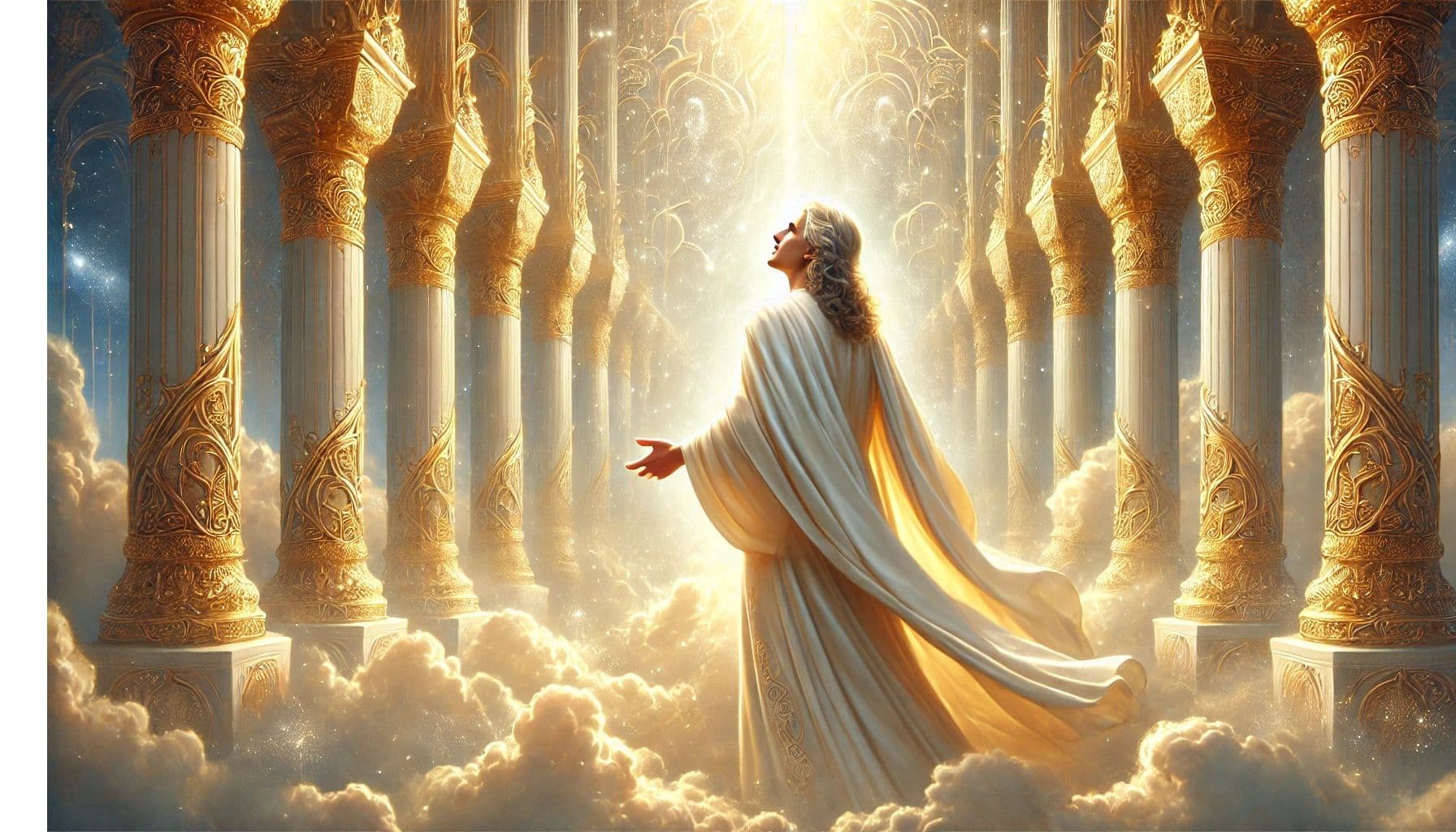 "cuando el joven entra debajo del trono de gloria, Dios lo acoge con un rostro resplandeciente..." | "Mira ahora al joven, que sale a tu encuentro desde detrás del trono de gloria. No te inclines ante él, porque su corona es como la corona de su Rey... Y el manto (וחלוק) sobre él es como el manto (בחלוק) de su rey..." |