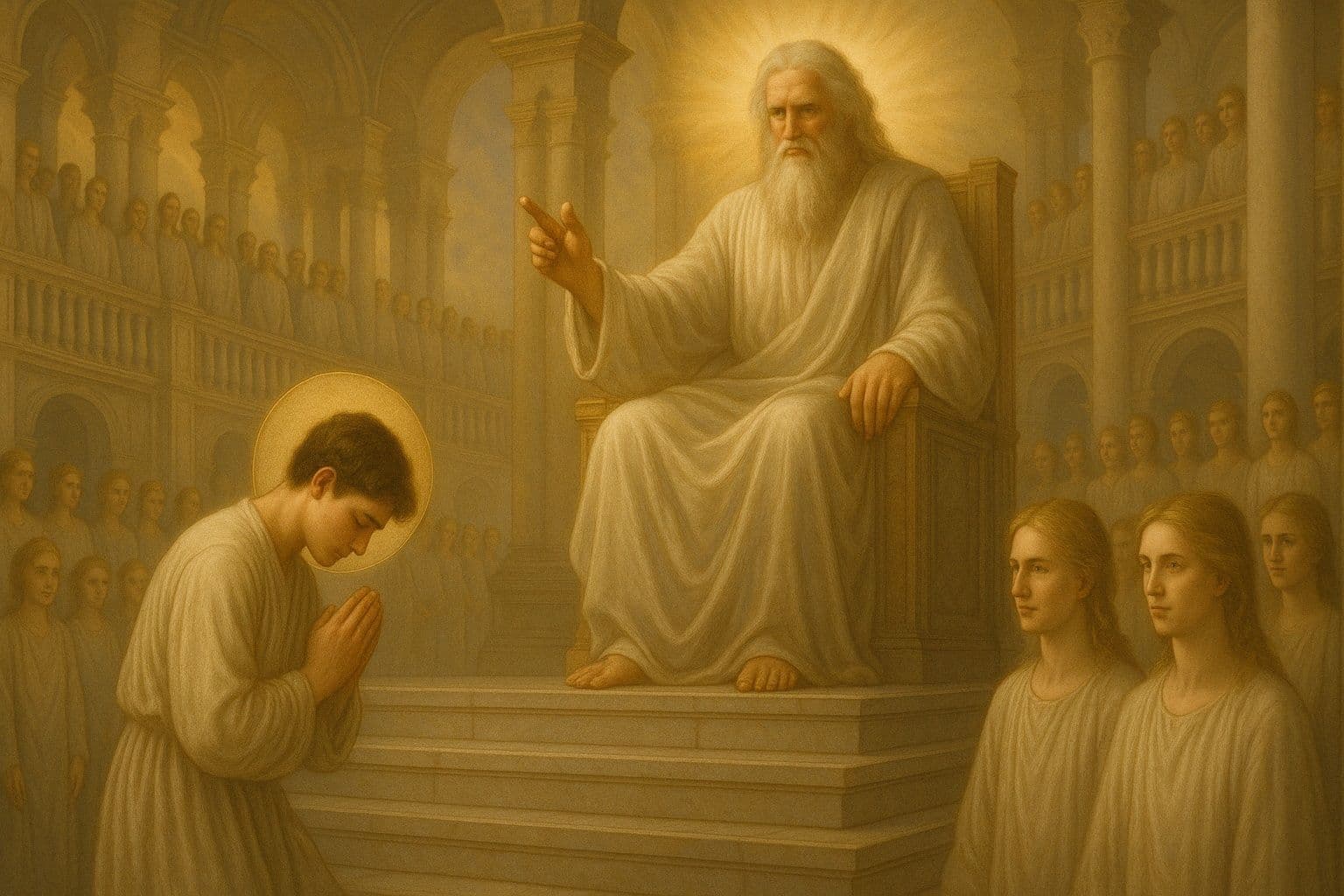 Nuevamente el Santo, bendito sea, respondió y les dijo: ¿Qué sois para que entréis y habléis en mi presencia? Me deleito en éste más que en todos vosotros, y por eso será príncipe y gobernante sobre vosotros en las alturas. Inmediatamente todos se levantaron y salieron a mi encuentro, se postraron ante mí y dijeron: "Feliz tú y feliz tu padre porque tu Creador te favorece".