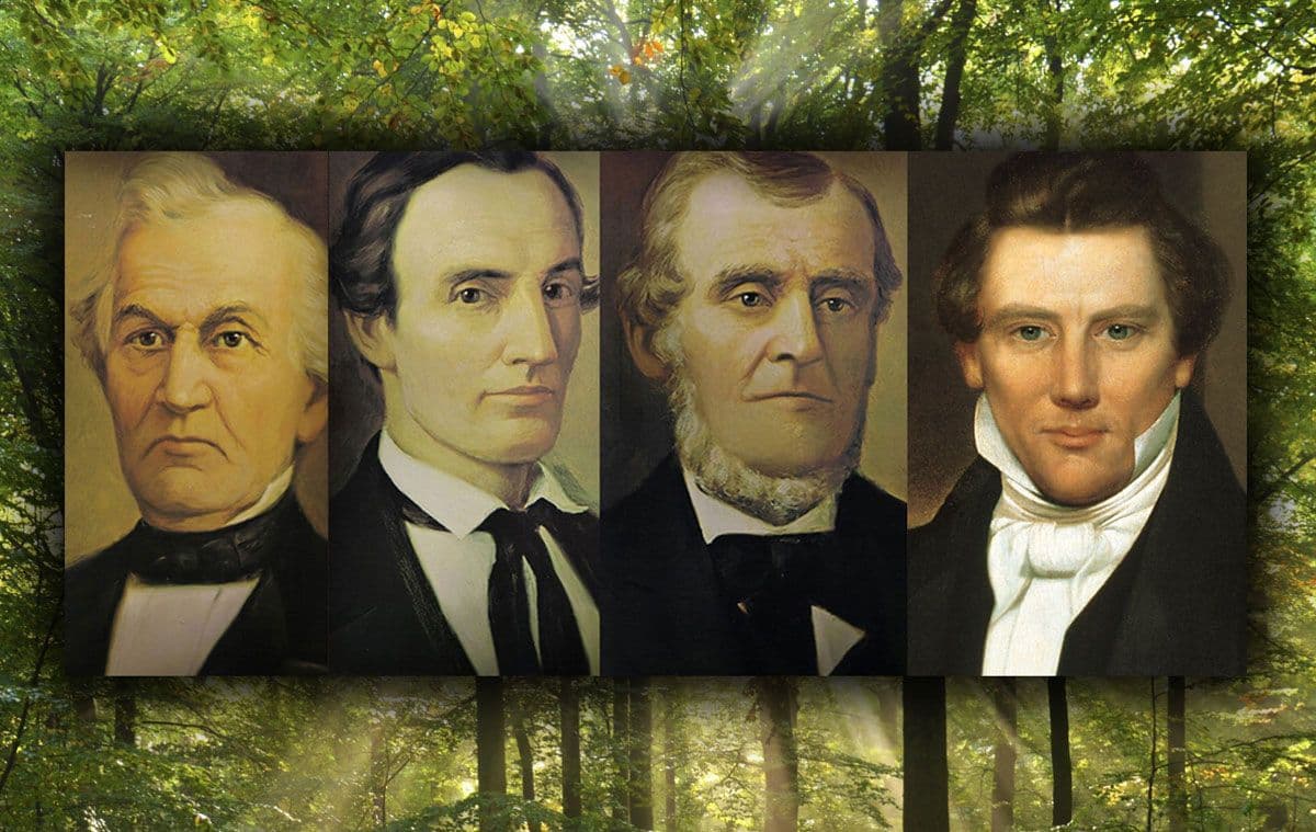 Pintura del ángel Moroni mostrando las planchas de oro a José Smith, Oliver Cowdery y David Whitmer. Artista desconocido
