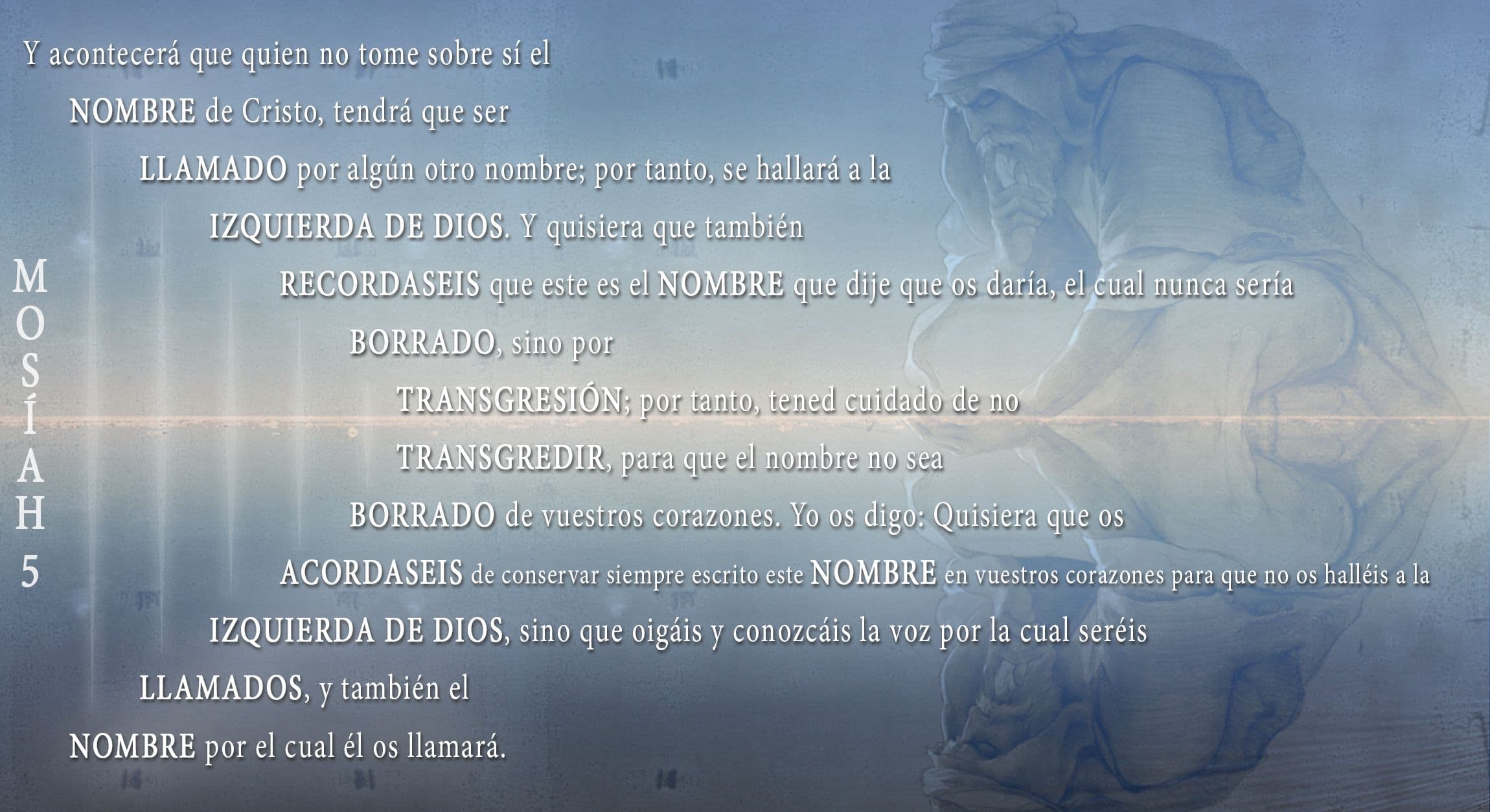 "[E]ste es el nombre que dije que os daría, el cual nunca sería borrado, sino por transgresión; por tanto, tened cuidado de no transgredir, para que el nombre no sea borrado de vuestros corazones. Yo os digo: Quisiera que os acordaseis de conservar siempre escrito este nombre en vuestros corazones para que no os halléis a la izquierda de Dios". Mosíah 5:11–12