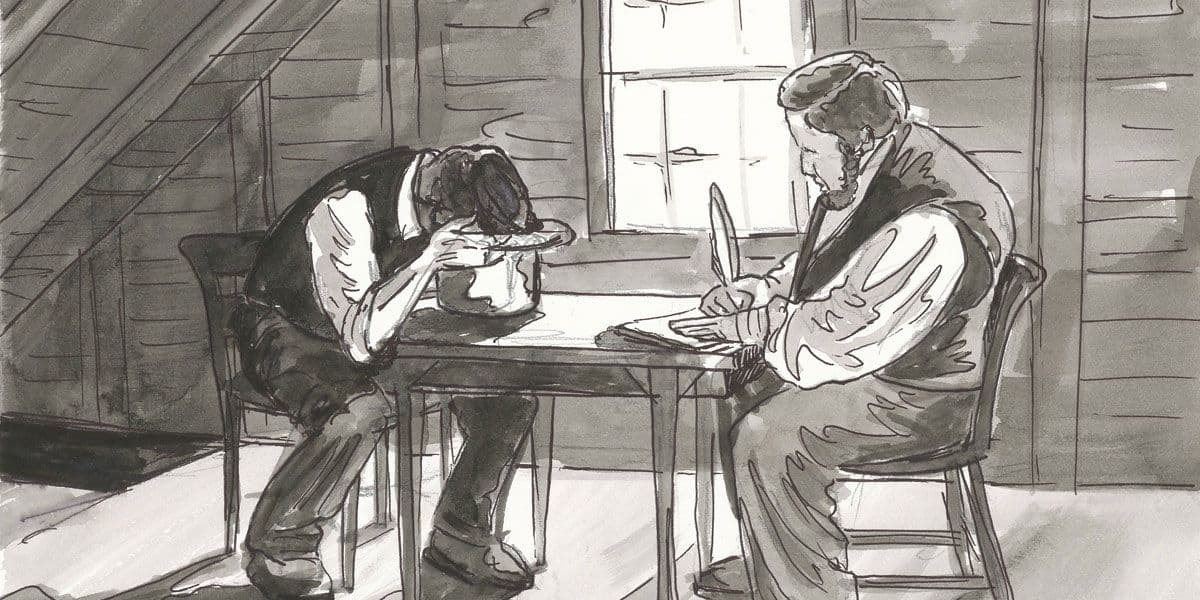 José Smith le da a Martin Harris las 116 páginas del manuscrito. Imagen a través de lds.org