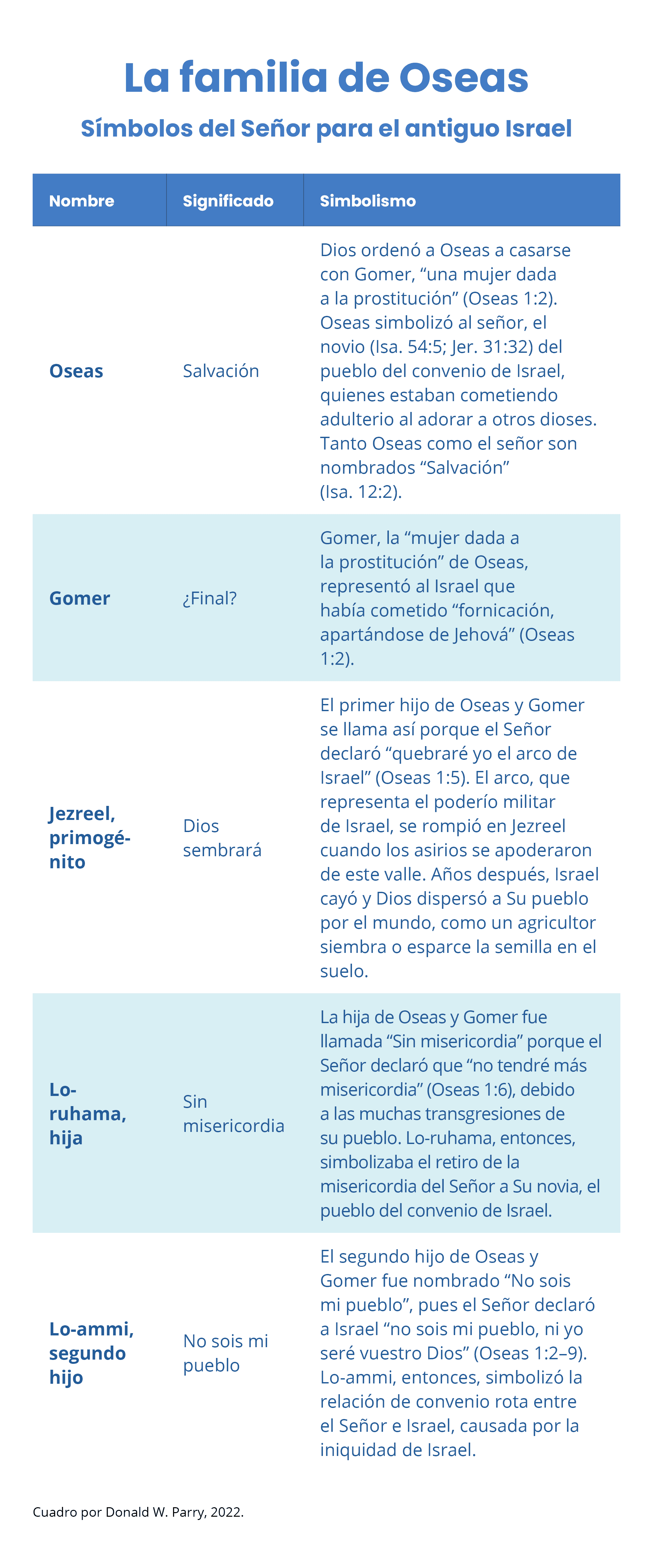 El cuadro presenta los nombres hebreos de cada uno de los cinco miembros de la familia (columna 1), el significado en español de los nombres (columna 2) y el valor simbólico de cada uno de los miembros de la familia (columna 3). Obsérvese cómo el Señor, a través de Oseas, empleó juegos de palabras especiales con los nombres de los tres hijos para enseñarnos acerca de Su relación con la casa de Israel.